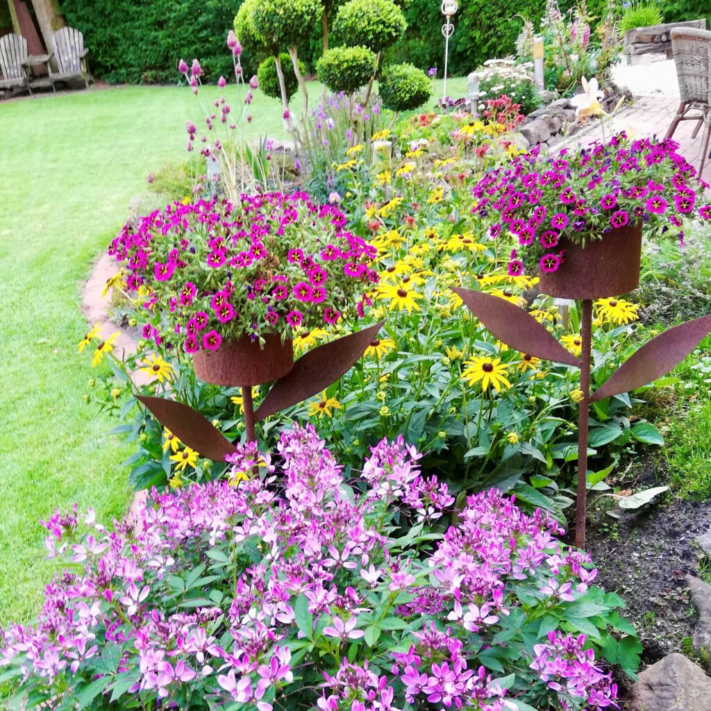 Unsere dekorativen Gartenfackeln aus Stahl verbinden modernes Design mit natürlicher Ausstrahlung. Die bewusst rustikale Oberfläche fügt sich harmonisch in jede Gartenlandschaft ein und setzt gleichzeitig elegante Akzente in Beeten, auf Rasenflächen oder entlang von Wegen.
