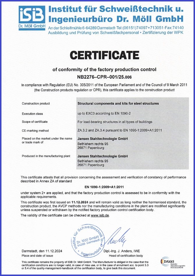 Unsere Kunden profitieren von geprüfter Qualität und höchster Verlässlichkeit: Seit 2014 sind wir nach ISO 1090-2 und DIN 3834-3 zertifiziert – ein starkes Zeichen für Präzision, Sicherheit und nachhaltige Fertigung auf höchstem Niveau.